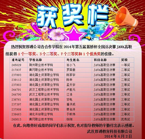 目前,2014年第五屆藍(lán)橋杯全國(guó)軟件和信息技術(shù)專業(yè)人才大賽成功落幕,現(xiàn)個(gè)人賽獲獎(jiǎng)名單已經(jīng)在大賽官網(wǎng)公布。武漢厚溥教育科技有限公司合作院校有12名大學(xué)生在本屆藍(lán)橋杯總決賽中榮獲佳績(jī)!