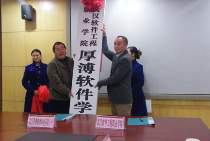 會(huì)議第三項(xiàng)雙方簽署協(xié)議,由武漢厚溥教育科技有限公司總經(jīng)理胡俊和武漢軟件工程職業(yè)學(xué)院副校長(zhǎng)王路群共同簽署相關(guān)文件。同時(shí)在熱烈的掌聲中廖世平書(shū)記和陳相陽(yáng)董事長(zhǎng)為新成立的厚溥軟件學(xué)院揭牌。