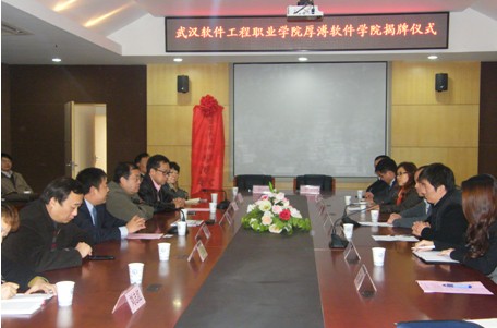 2013年12月2日下午15:00武漢厚溥教育科技有限公司與武漢軟件工程職業(yè)學(xué)院(以下簡(jiǎn)稱武軟)在武軟實(shí)訓(xùn)中心二樓會(huì)議室舉行了校企合作共建院系厚溥軟件學(xué)院揭牌儀式。